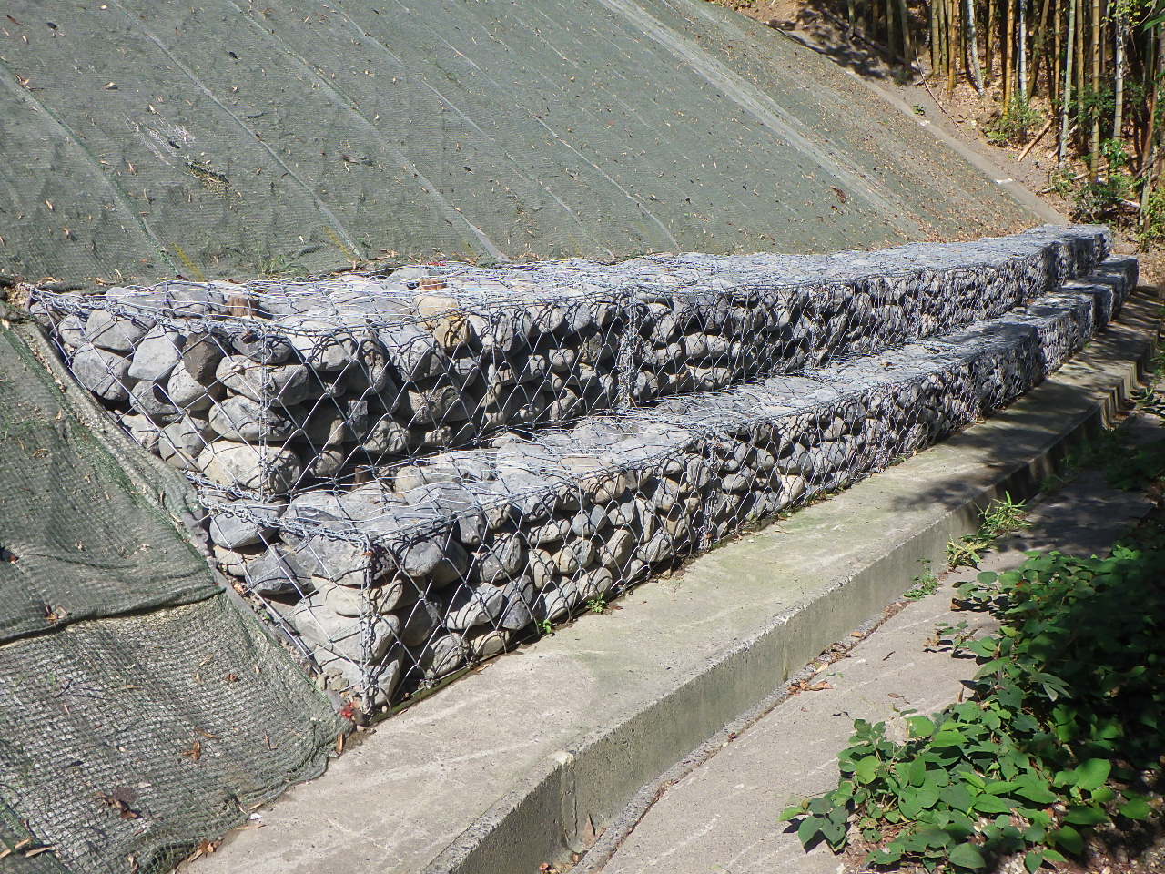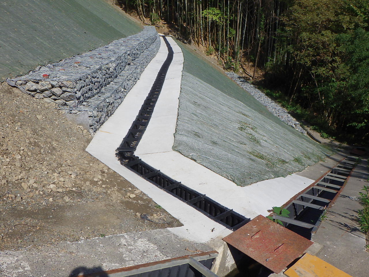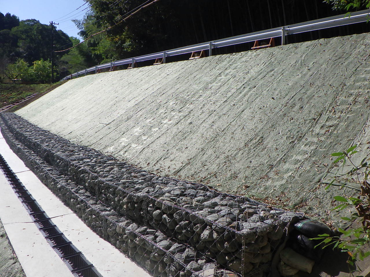 規模・構造 復旧延長:37m 法面保護工:530㎡ 排水層工:35m ふとんかご工:55m 小段排水工:35m 地下排水工:35m 集水枡工:1箇所 ガードレール設置・撤去工:37m 工事用道路工:72m