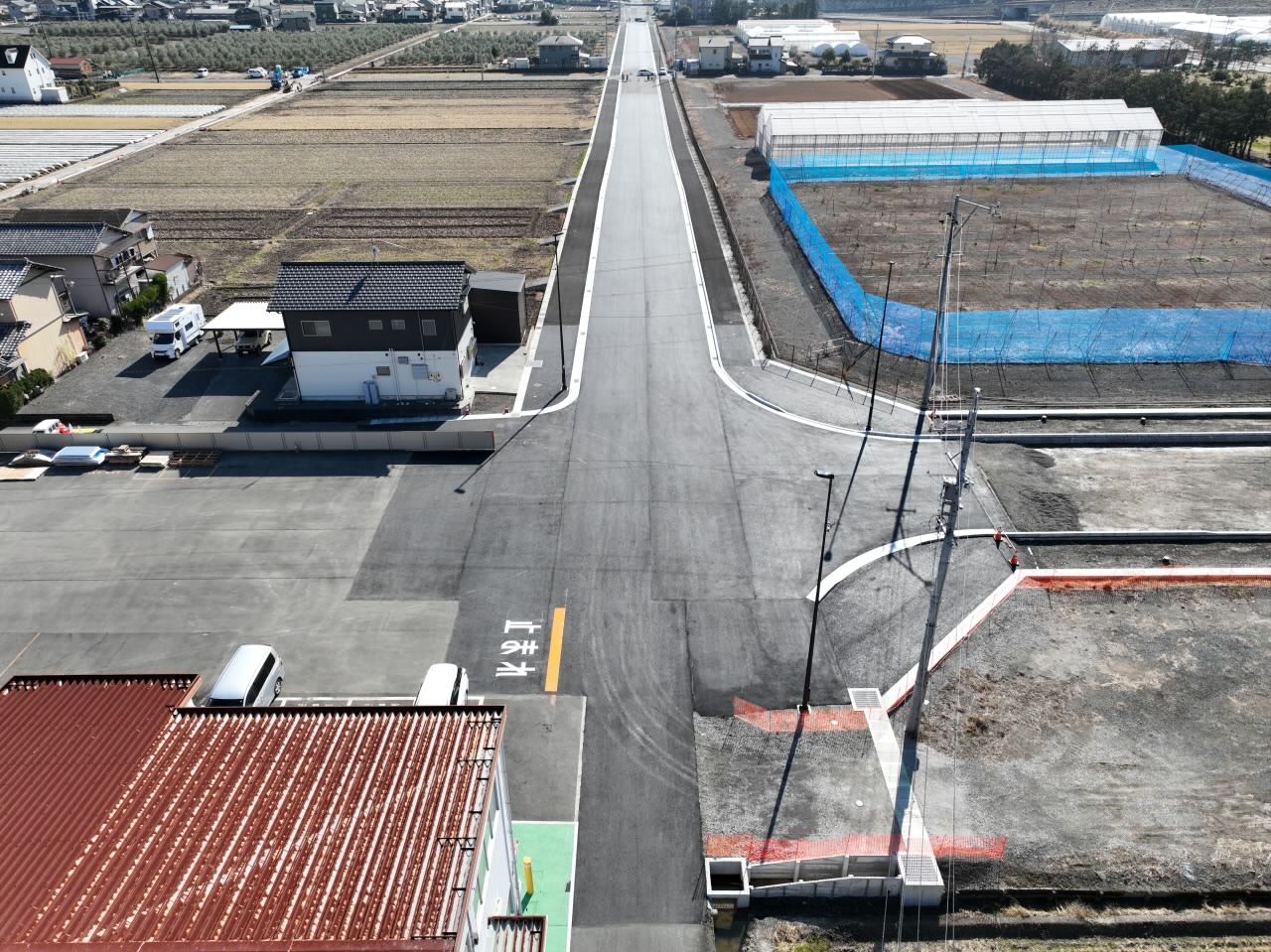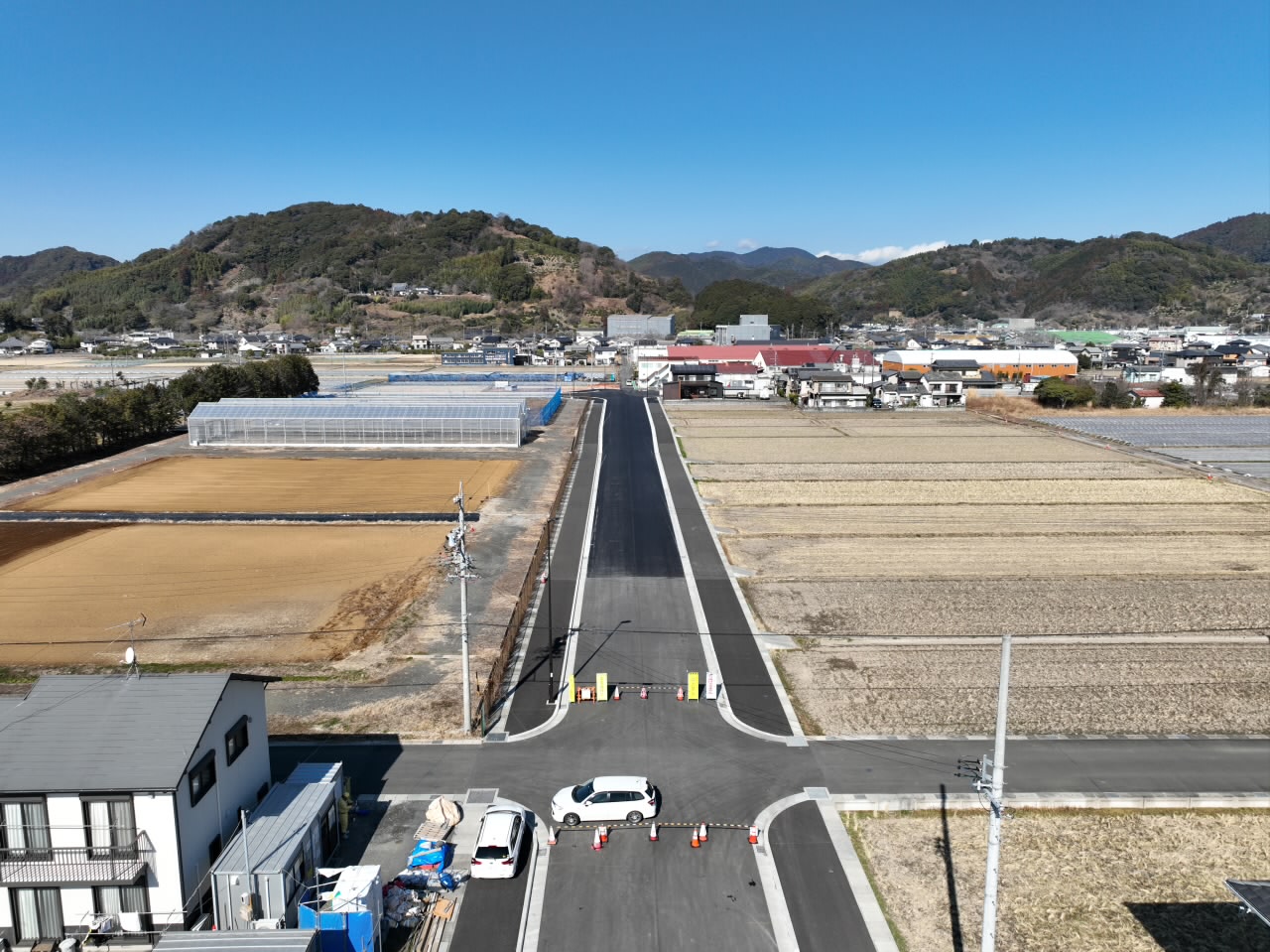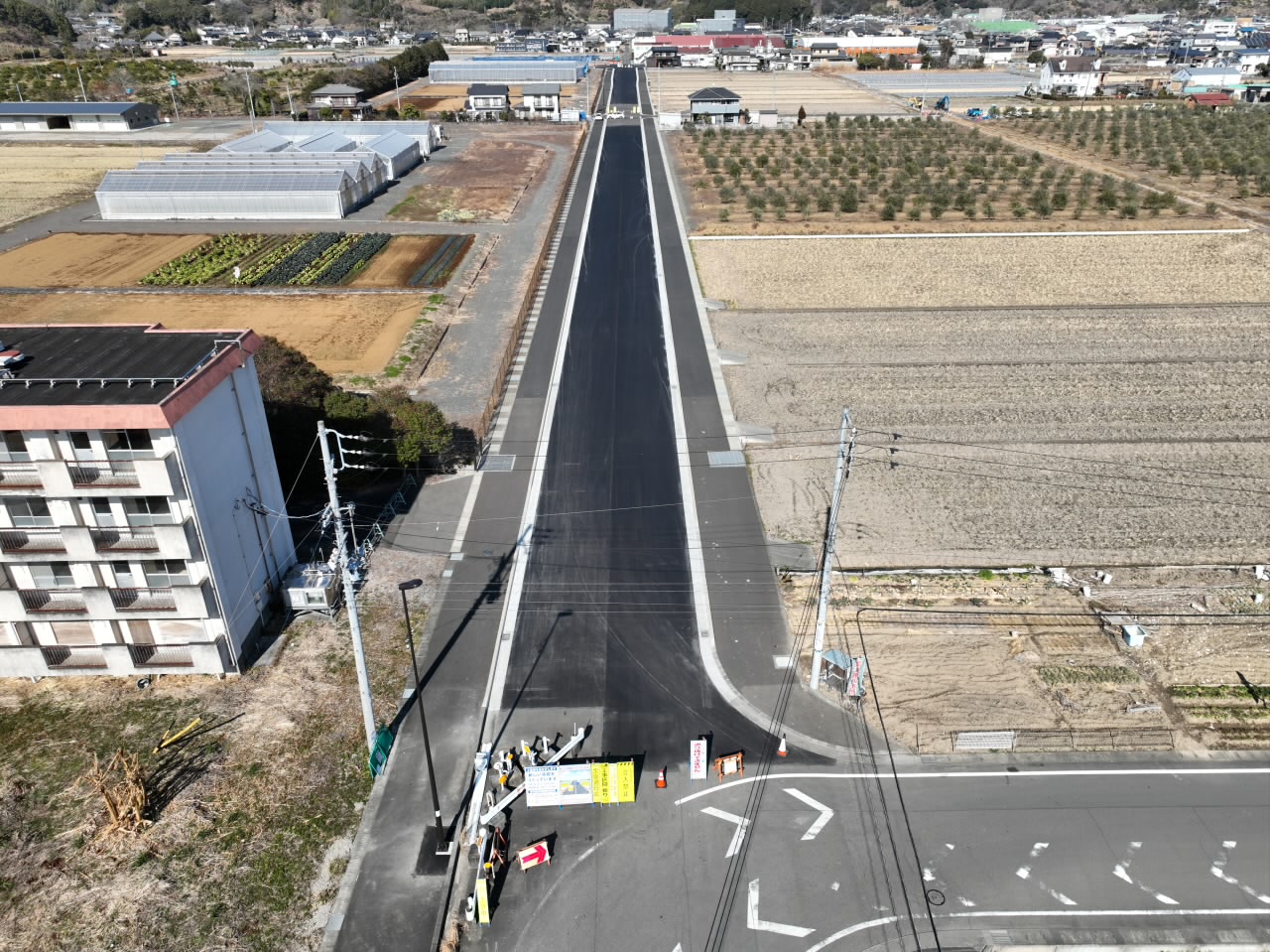 本工事は新東名高速、東名高速、国道1号藤枝BPなどの主要拠点から高田工業団地等へのアクセス向上のための道路整備工事です。施工の7割が舗装工事で施工延長が約400mと施工範囲が広く、第三者への安全確保には標識やバリケードにて注意喚起を促しました。舗装工事は天候に左右される工種ではありましたが、協力会社の協力により雨が降る時期前にすべての工事を完了することが出来ました。今回の工事では改めて建設業界の人手不足を痛感し、物を造るだけでなく人と人との繋がりがあって現場が成立することを実感しました。地域の皆様・協力会社の皆様、ありがとうございました。